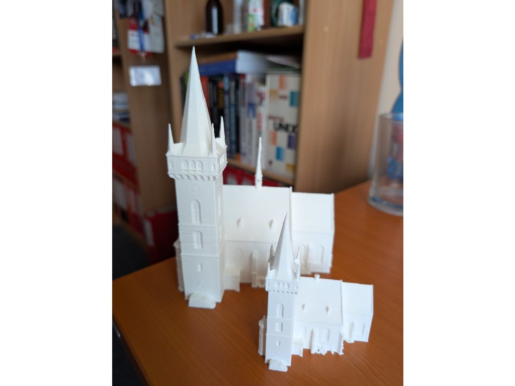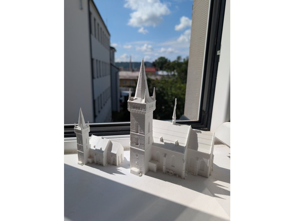 Model Kostel sv. Jana Křtitele ve Dvoře Králové nad Labem. Kostel je vytištěn na 3D tiskárně, materiál PLA.