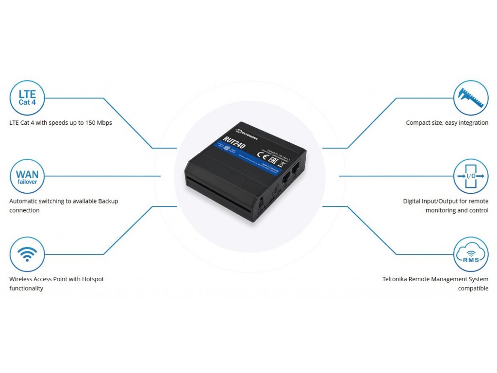 SMA konektory pro připojení externích antén dovolují anténu umístit na vhodné místo k dosažení co možná nejvyšší úrovně přijímaného signálu. RUT240 podporuje špičkové bezpečnostní funkce a je často používán jako 4G záloha. Vzdálené připojení, Out-of-Band management, pokročilé VPN funkce a podpora tunelů z něj dělá ideální zařízení pro IoT sítě.